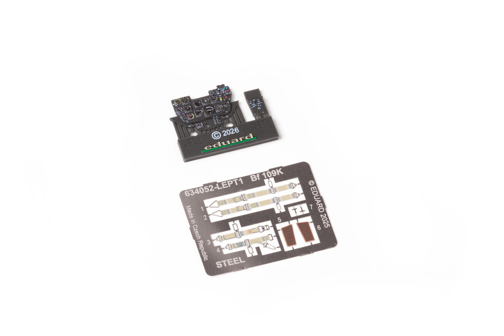 LööK set Brassin pre-painted dashboard and STEEL seat belts for Bf 109K-4 in 1/32 scale.